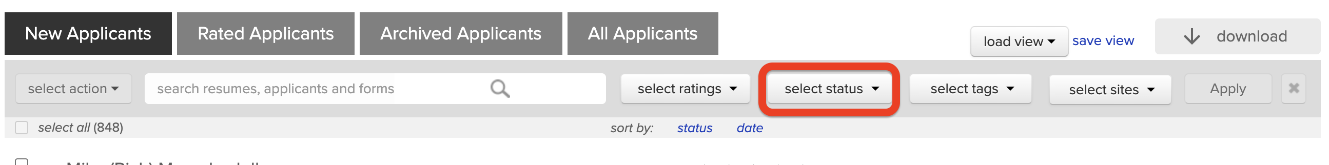 1. From the Applicants list, click the dropdown menu next to Select status (or similar wording) above or beside your list.